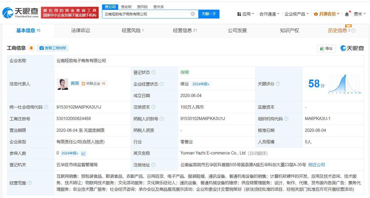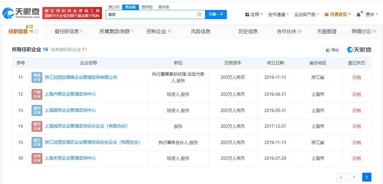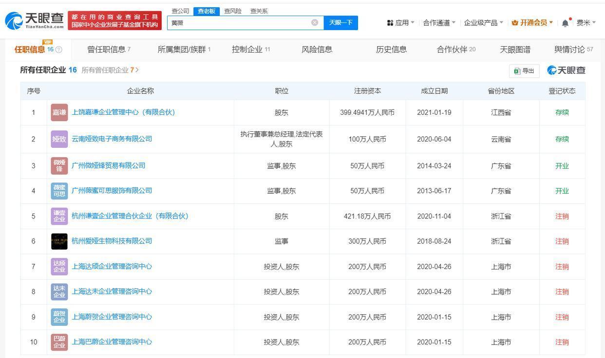 天眼查App显示,近日,黄薇(薇娅)名下上海巴蔚企业管理咨询中心、上海达颀企业管理咨询中心、上海蔚贺企业管理咨询中心等企业的登记状态由存续变更为注销,此外,云南娅致电子商务有限公司近日也新增一则简易注销公告,公告期自2025年1月23日至2025年2月12日。